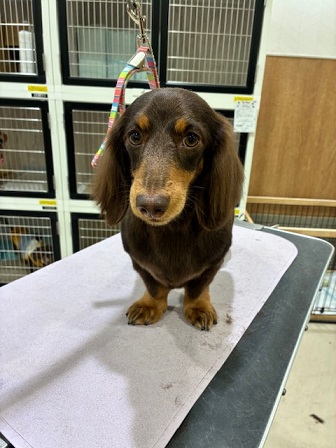 ダックス・ツルツルカット♪ 全身2のバリカンで、ツルツルにカットしました♪ 尻尾はライオンちゃんです♪ |