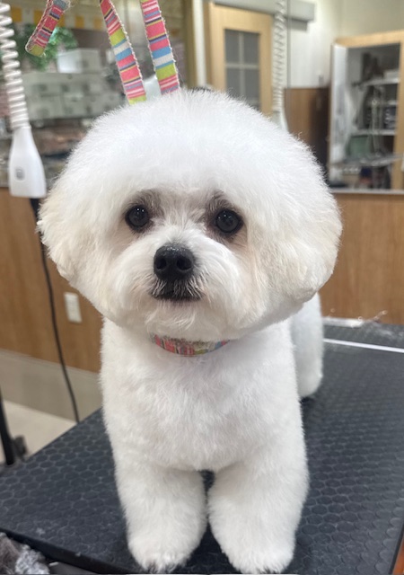 チワワとマルチーズちゃんのミックスで毛が柔らかく目元、口元が垂れてきやすいので出来るだけスッキリめにカットしてまん丸アフロ風にカットしました。