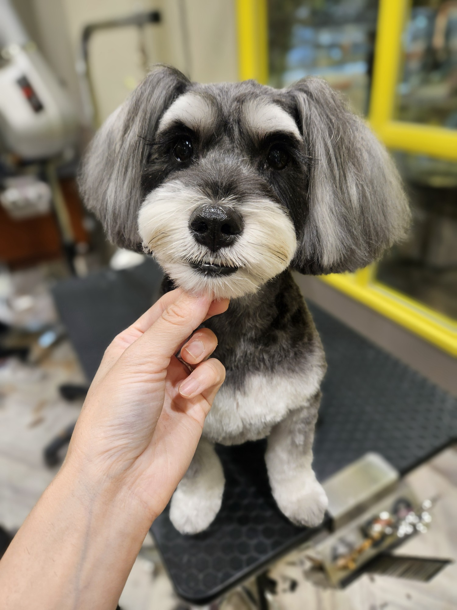 ミニチュアシュナウザーのテディベアカット 全体的に短めにカットし、お顔はテディベアカットで丸く仕上げました。お耳もすっきりと耳のフチに丸くしました。 |