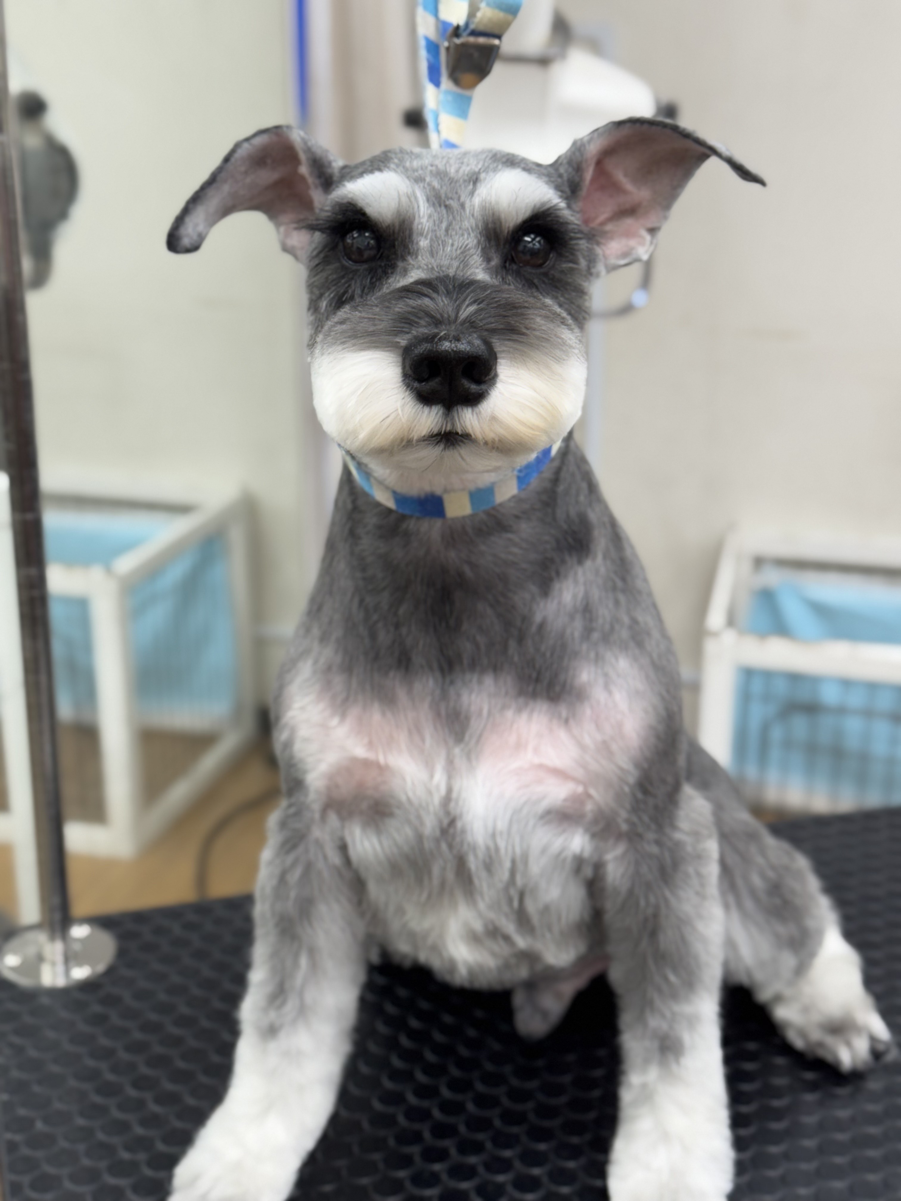 もももひかん☆じんくん 頭から首のモヒカンをピンクに染めました♪ピンク色がシュナウザーの毛色と馴染んでパープルにも見えます☆ 足はふわっと、おヒゲは丸くして可愛さも出しました。 |