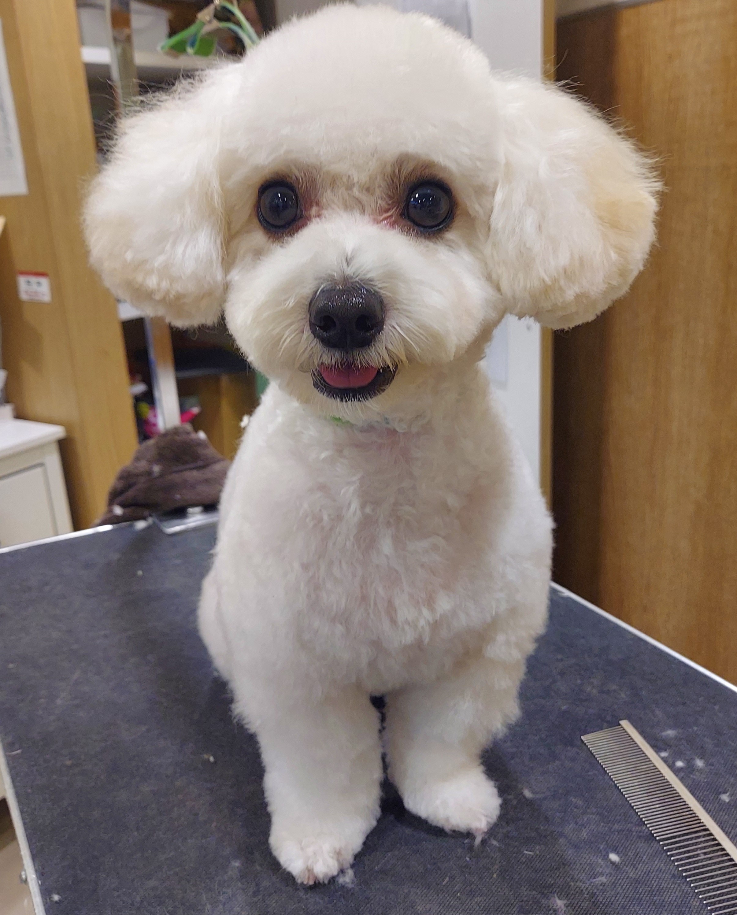 まんまる頭のアフロ犬★ 被毛ケアの良質シャンプーを使用し、白さを際立てました 縮毛をしっかり延ばし、まん丸のお顔と太めの足に仕上げました |