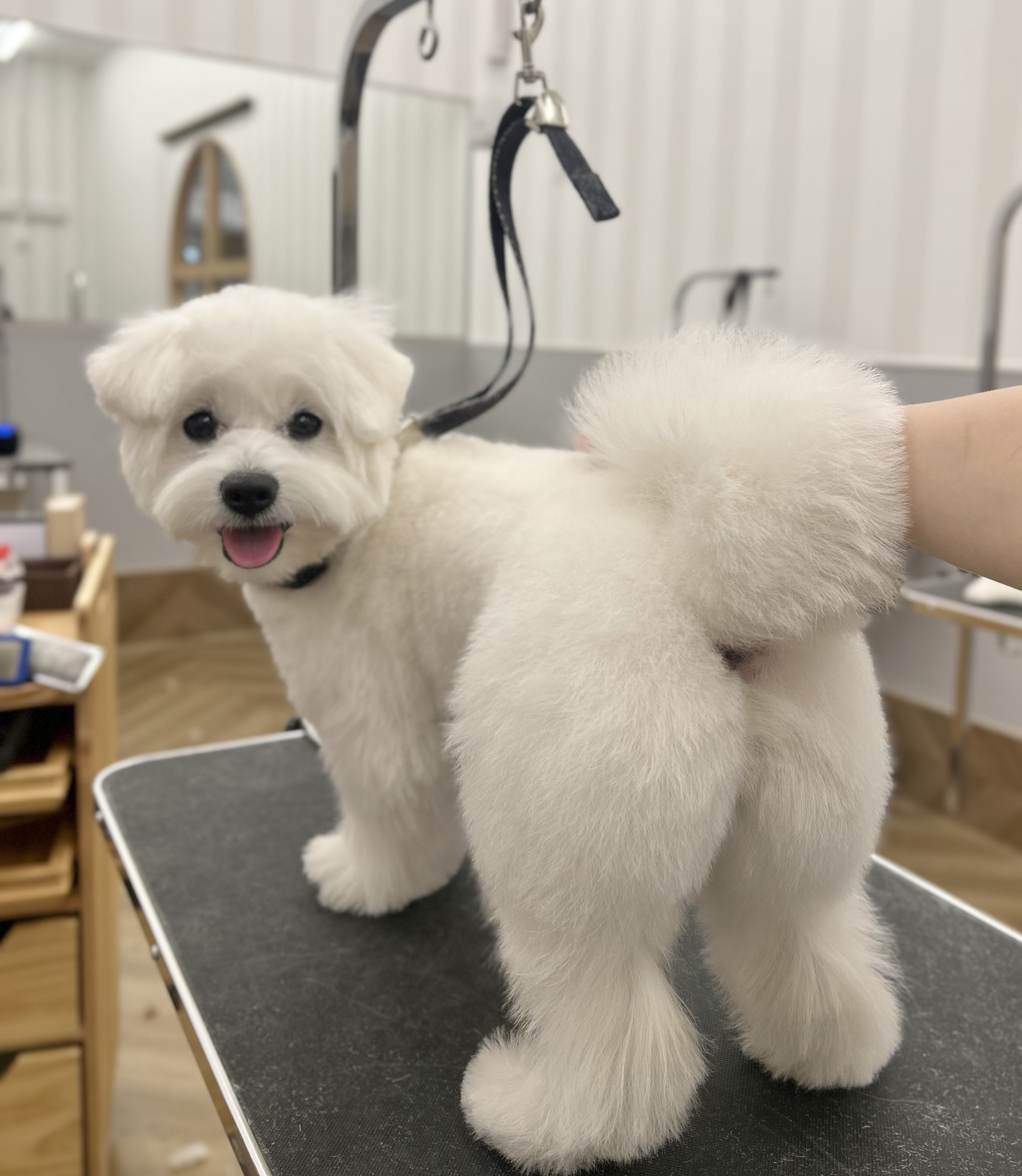 ふんわりベア ふんわりベアカットです。全身ハサミ仕上げでふんわり残して足はスッキリめにしました。 ミックス犬です。 |
