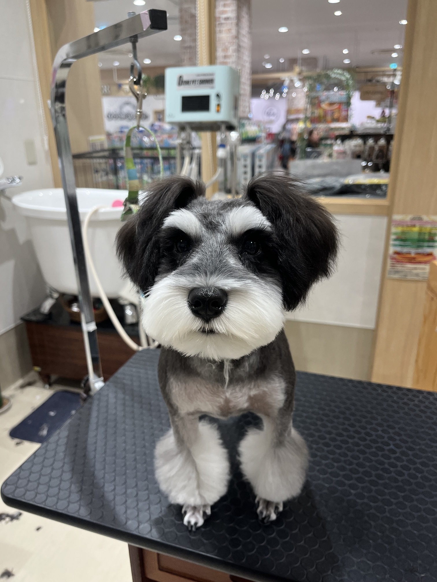 シュナのテディ風カット まつ毛を残して可愛らしいイメージでカットしました♪ 身体は5mmバリカンでスッキリ、お耳も伸ばしてから丸く整えてテディ風のお顔にしました! |