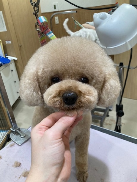 トイプードルのカット 体6mmのバリカン、手足は細めのブーツカット。 指先はツルっとして隠しています。 頭とお耳はつなげて、マズルは横丸に。 |