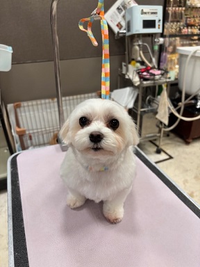 マルチーズ シャンプーコース 身体はそのままで、顔を丸くカットしました。 |