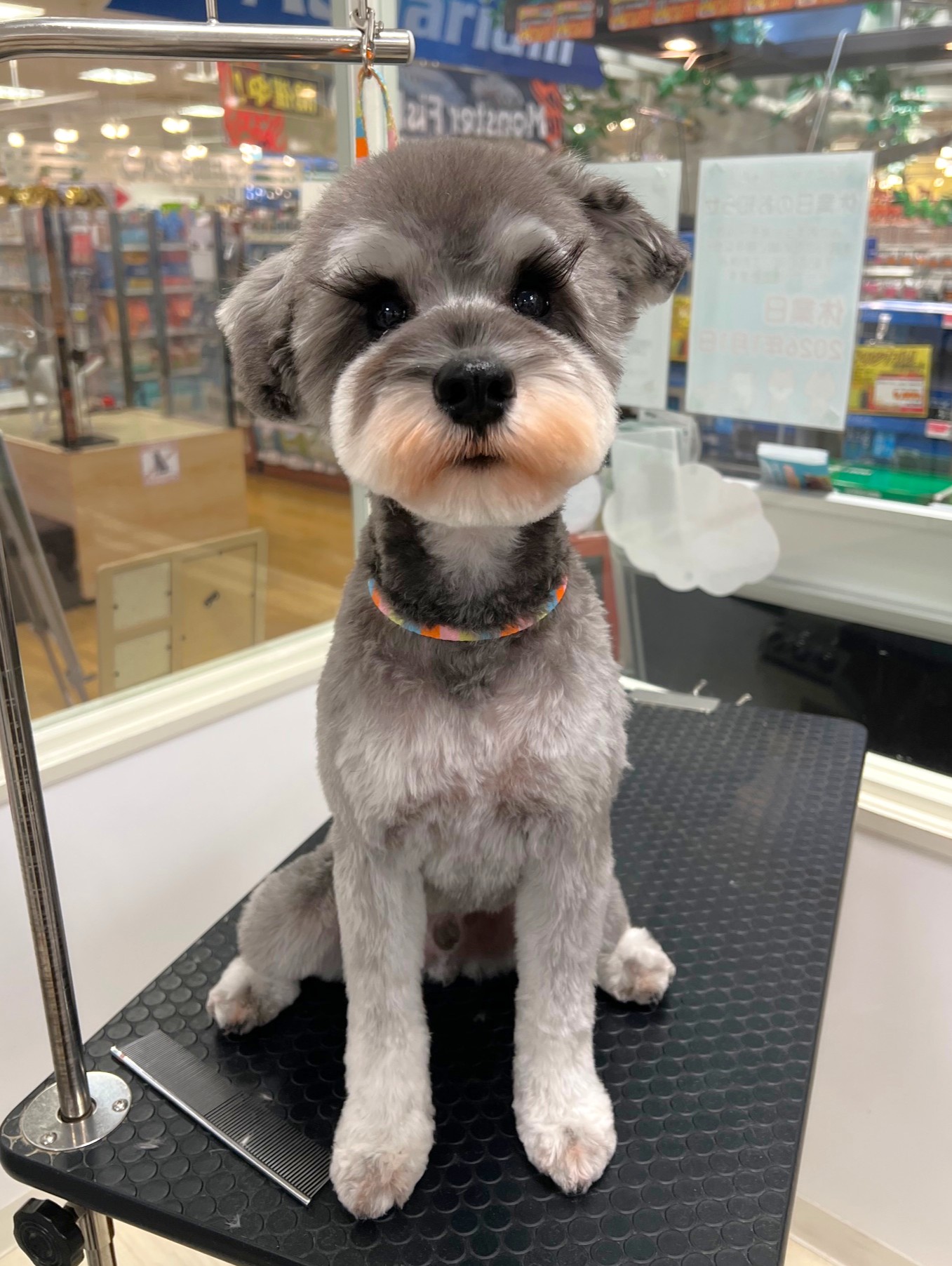 すっきりシュナちゃん ボディは、短く刈り込んで、 すっきりとさせていただきました。 足部分のアクセントと、ミニモヒカンで おしゃれな感じが出るようにカットさせて いただきました〜。 |