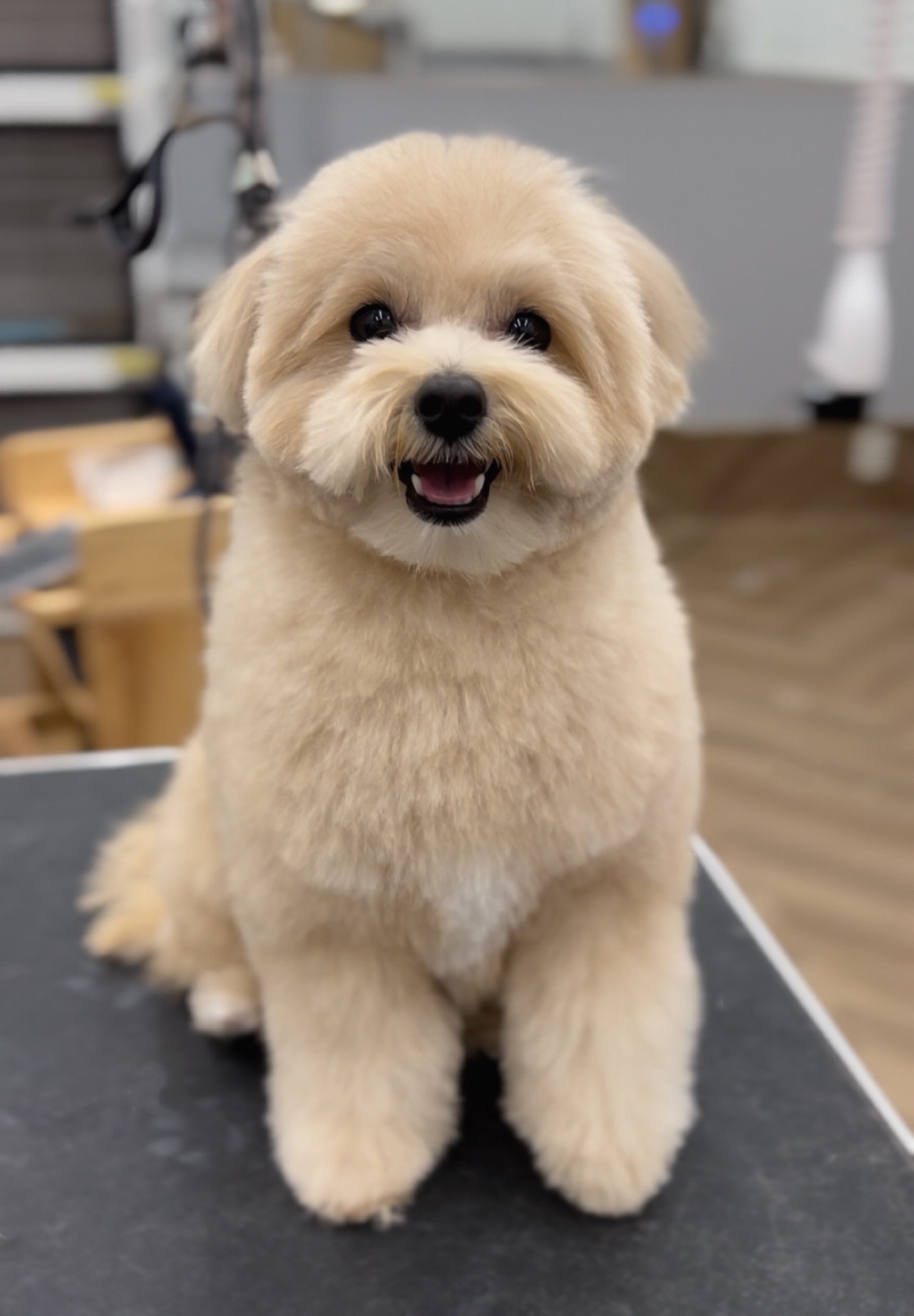 もかスタイル マルプー特有のさらさら毛質を利用してカットしました。歩くと被毛がゆれてとても可愛く仕上がりました |