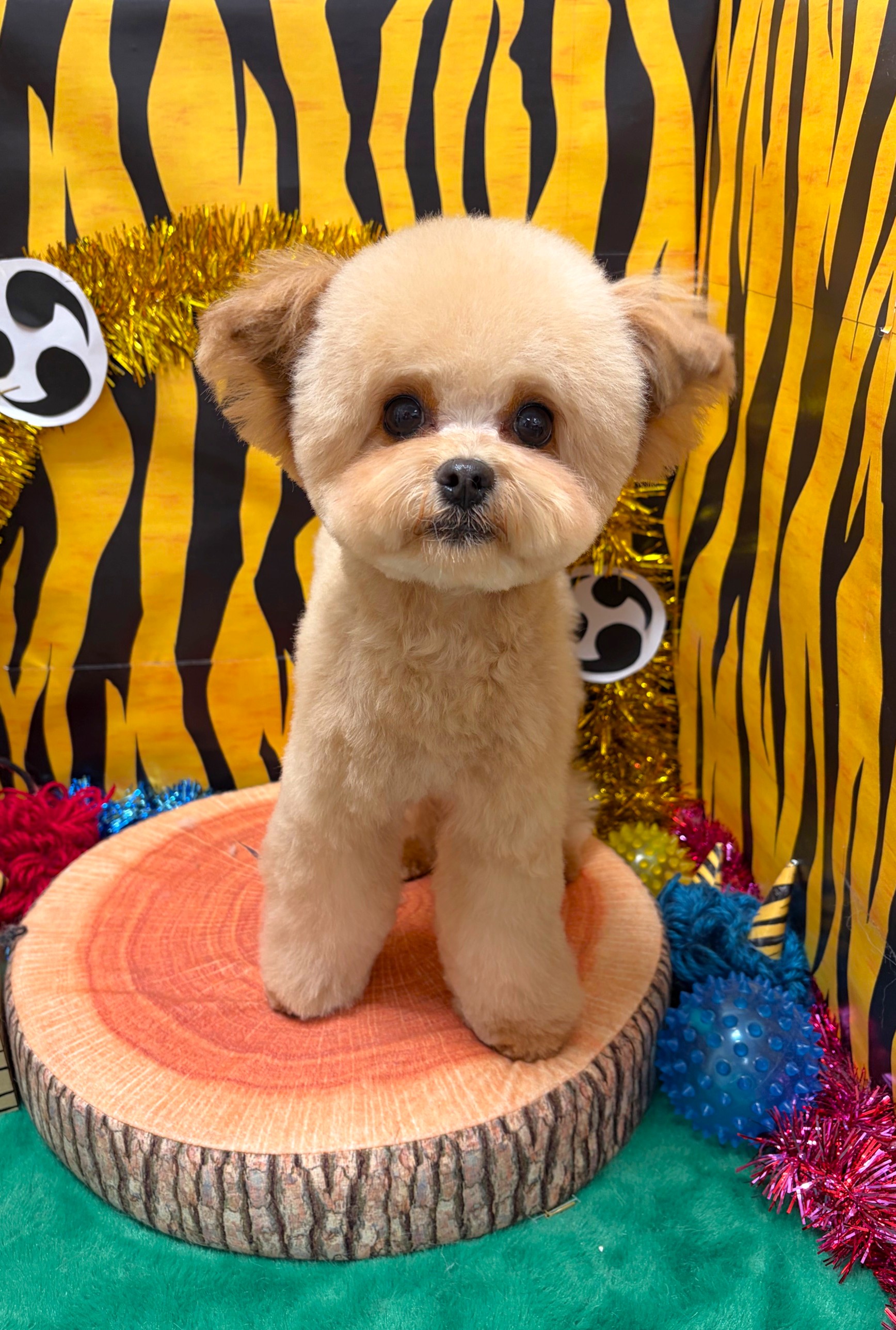 ぷぅちゃんのふんわりベアカット ビションちゃんとのミックスちゃんで骨格がトイプーちゃんに比べて太目なので大きめのふんわりベアカットにしています。 耳付も低めに見えるようにカットしています。 体は8ミリ、足は太目のストレート足です。 |