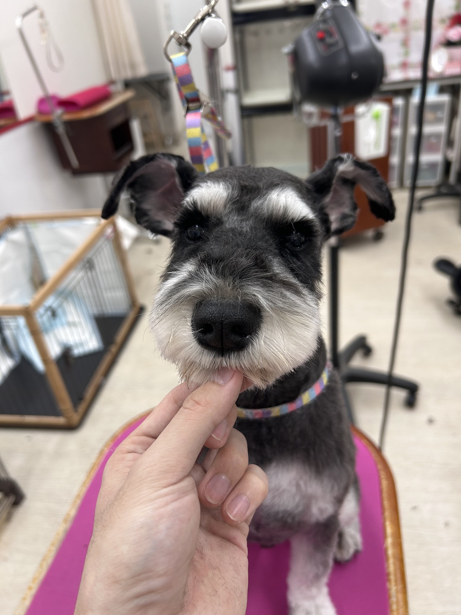 シュナウザーのソフトモヒカン ふわふわの毛を生かしてソフトモヒカンスタイルに☆ 足元はスッキリとお手入れのしやすいようにカットしています。 まんまるにカットしたマズルがポイントです♪ |