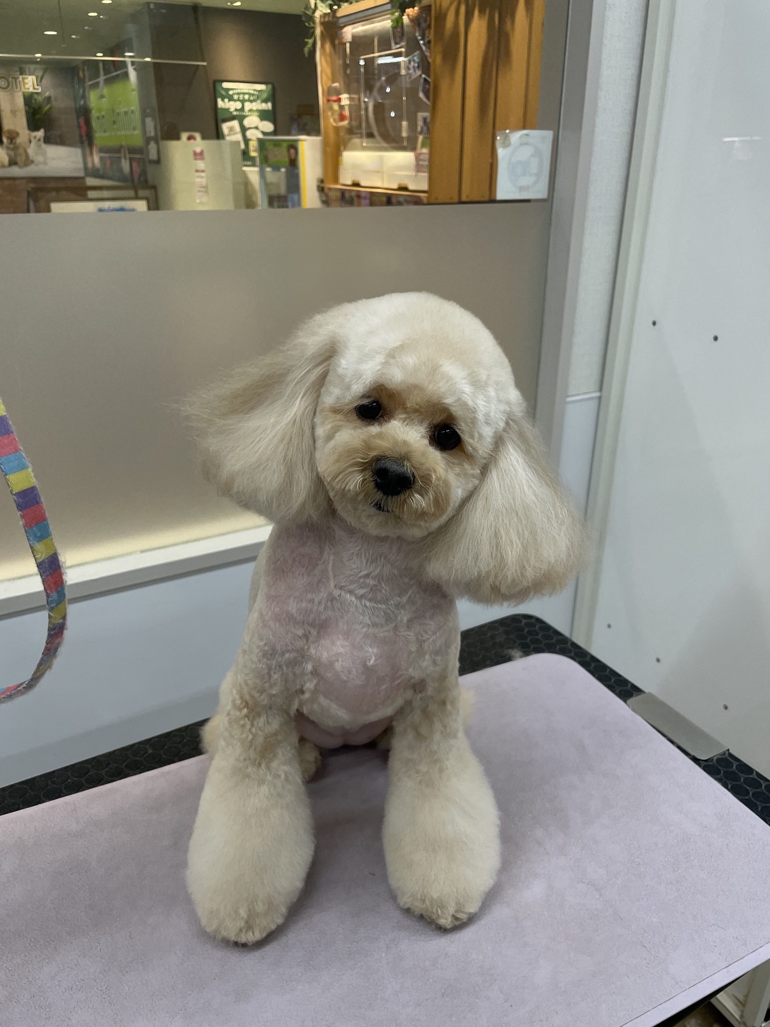 スッキリテディ 体を5mm、足を8mmバリカンですっきりと刈りました。 お顔は目元と口元を短くすることで、清潔感のあるカットになっています。 可愛さをしっかりと残しつつ、お手入れを行いやすくしたい方におすすめのカットです! |