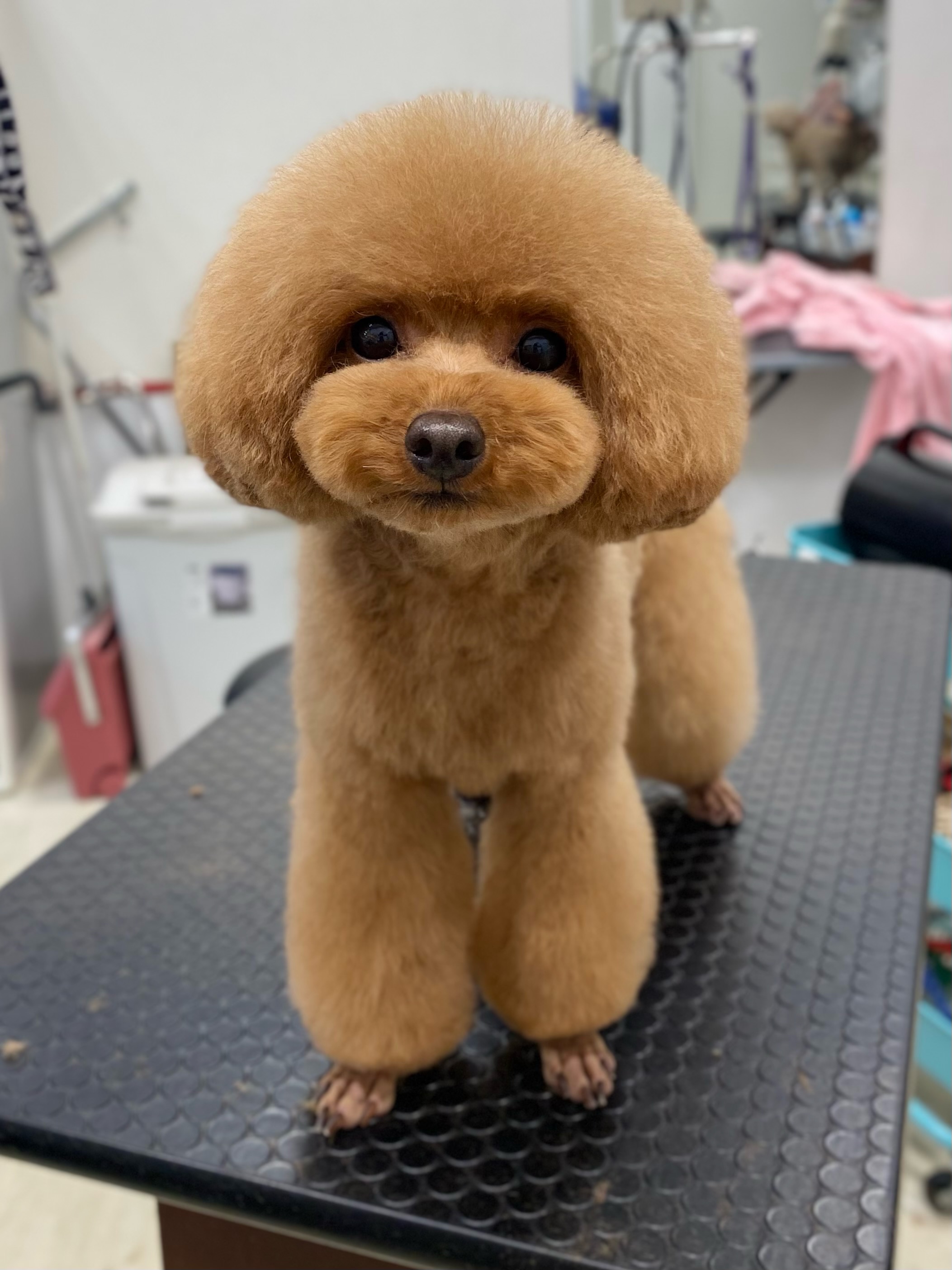 ふわふわテディボーイ☆ お耳の毛を伸ばして、ふわふわ感を出します☆ マズルは可愛らしい、だ円の丸にカットして 頭は丸く、足は体に合わせてストレートに☆ 全体のバランスを見ながら、仕上げて完成☆ |