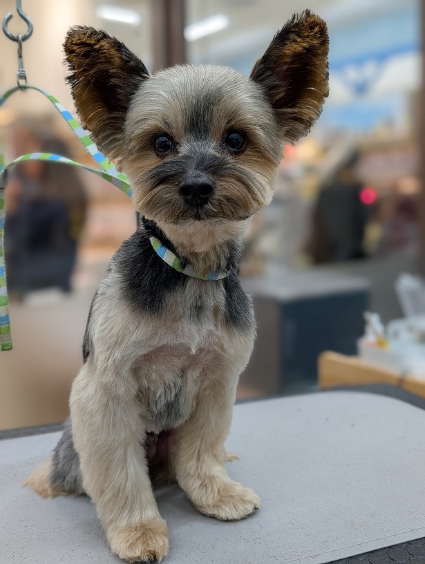 ヨーキーのカット 5mmのバリカン使用。 手足の先はフレアに。 お顔は耳とつなげて。 |
