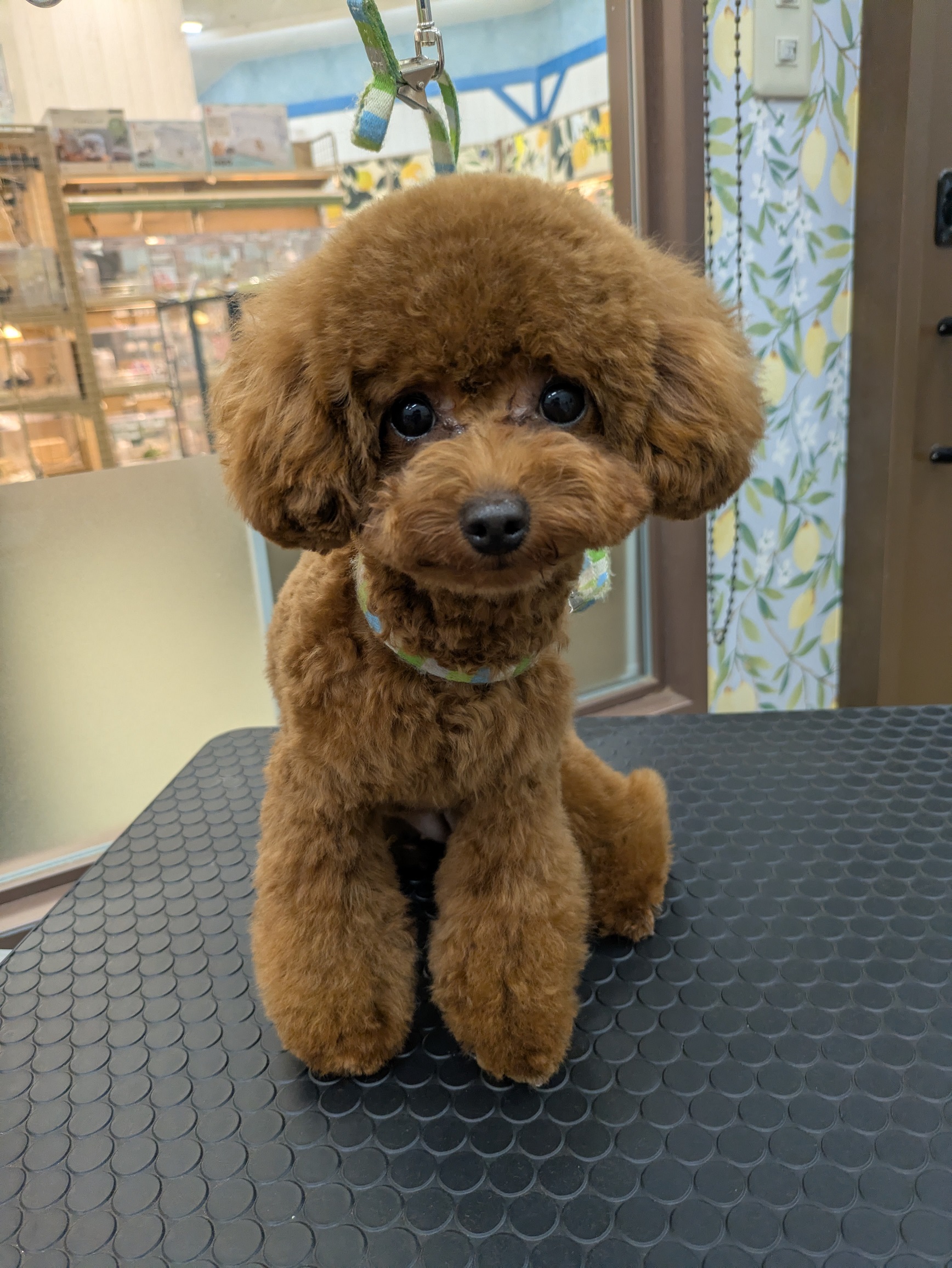 くーくんのテディベアカット フェイスラインを丸く取って目元スッキリ可愛くカットしました。お耳のバランスも一番似合いそうなところで仕上げました! |