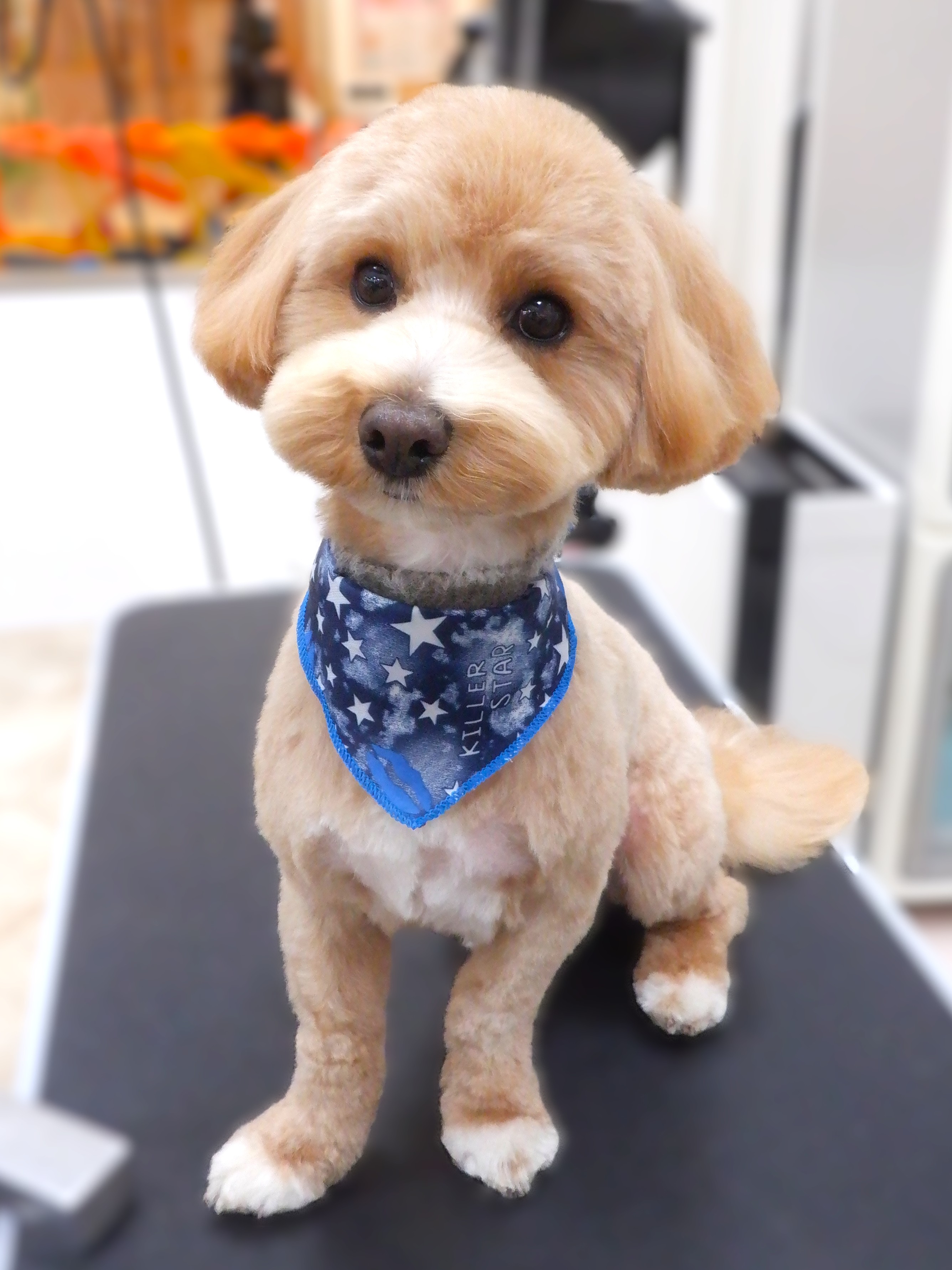 ふわふわもこもこ 体は8ミリバリカンで刈り、足は体に合わせてハサミでカット。頭の上から耳の毛までを繋げて、子犬ちゃんのようなあどけなさを感じさせるカットになりました! |