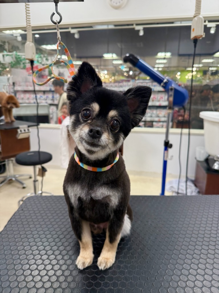 ココちゃんふんわりカット 手足、体は19mmで長めのバリカンをかけて最後ハサミで仕上げています。 お顔は丸く、お耳はフチぎりでカットしました。 |