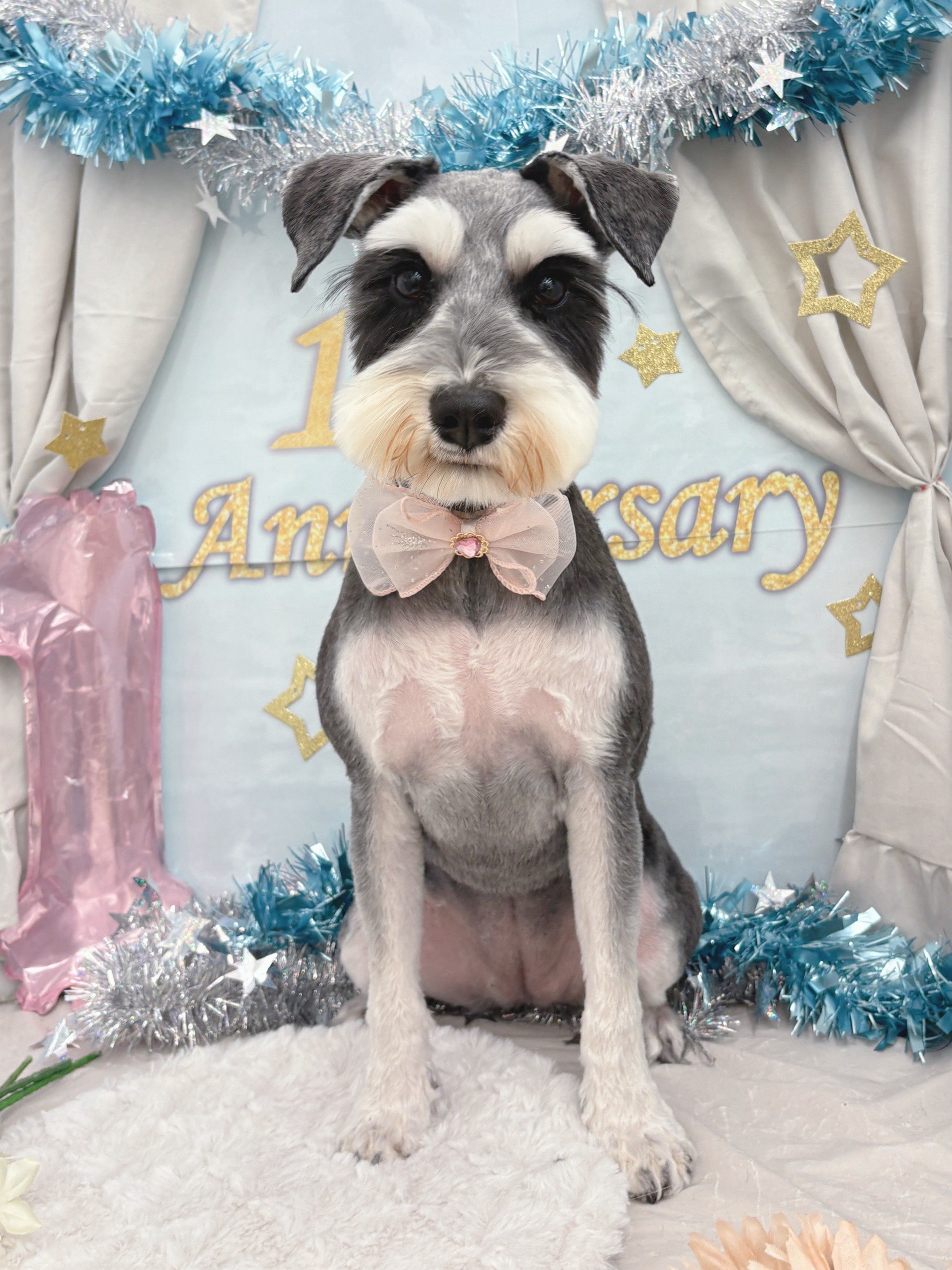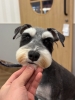 シュナテディ 毛量があるので顔はテディ風に丸く仕上げて耳も短く丸くしています。 体は3ミリで刈って肢はブーツカットにしていくため、付け根部分はスッキリカットしています。しっぽは丸くうさぎのようにカットしました。 |