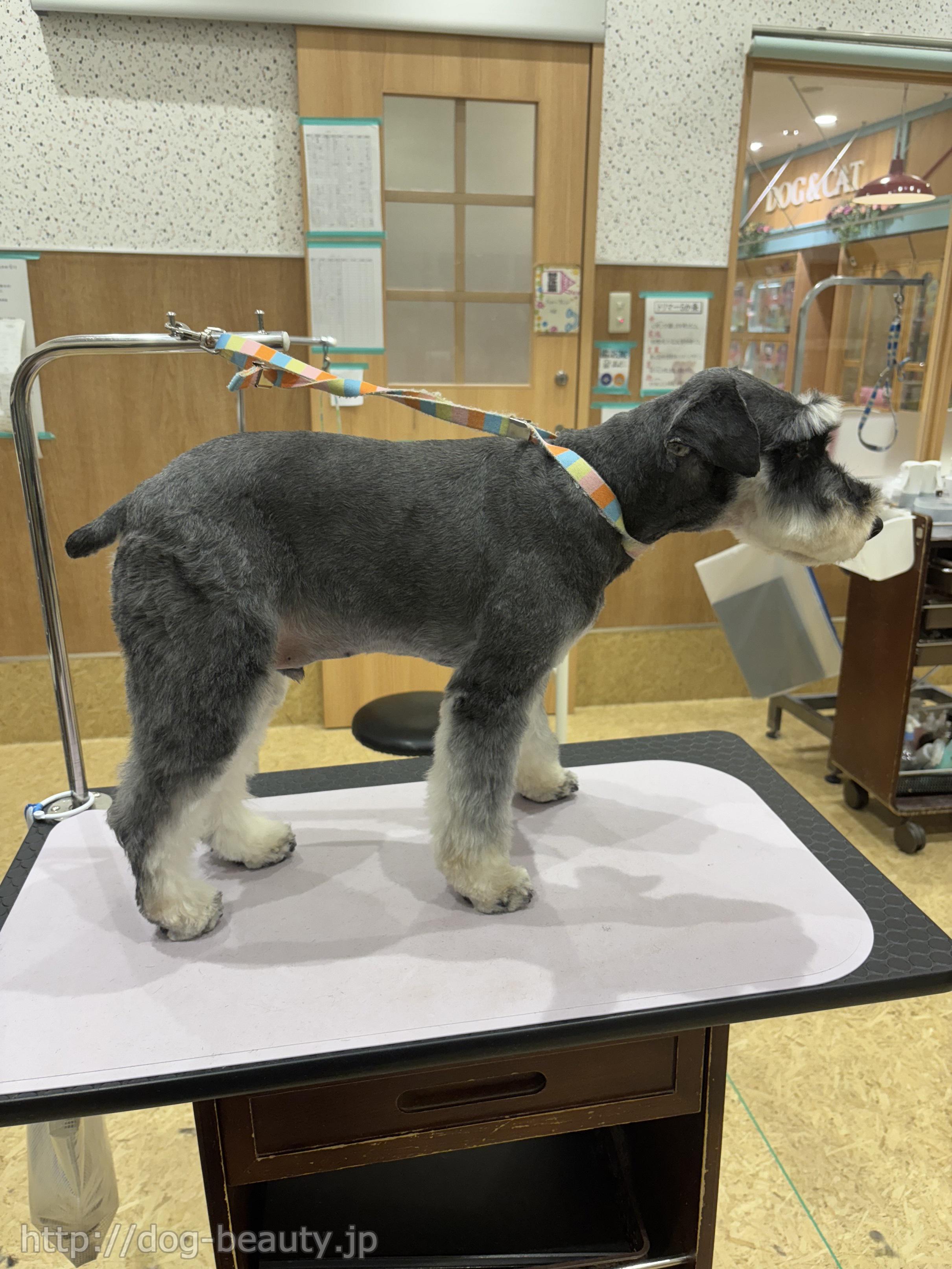 耳と頭を2mmバリカンでスッキリと刈り、まつげも残さず短くカットしました。 マズルを丸くすることで、クールでキュートなカットになっています。 シュナ特有のかっこよさを残しつつも、かわいさも欲しい方におすすめのカットです!