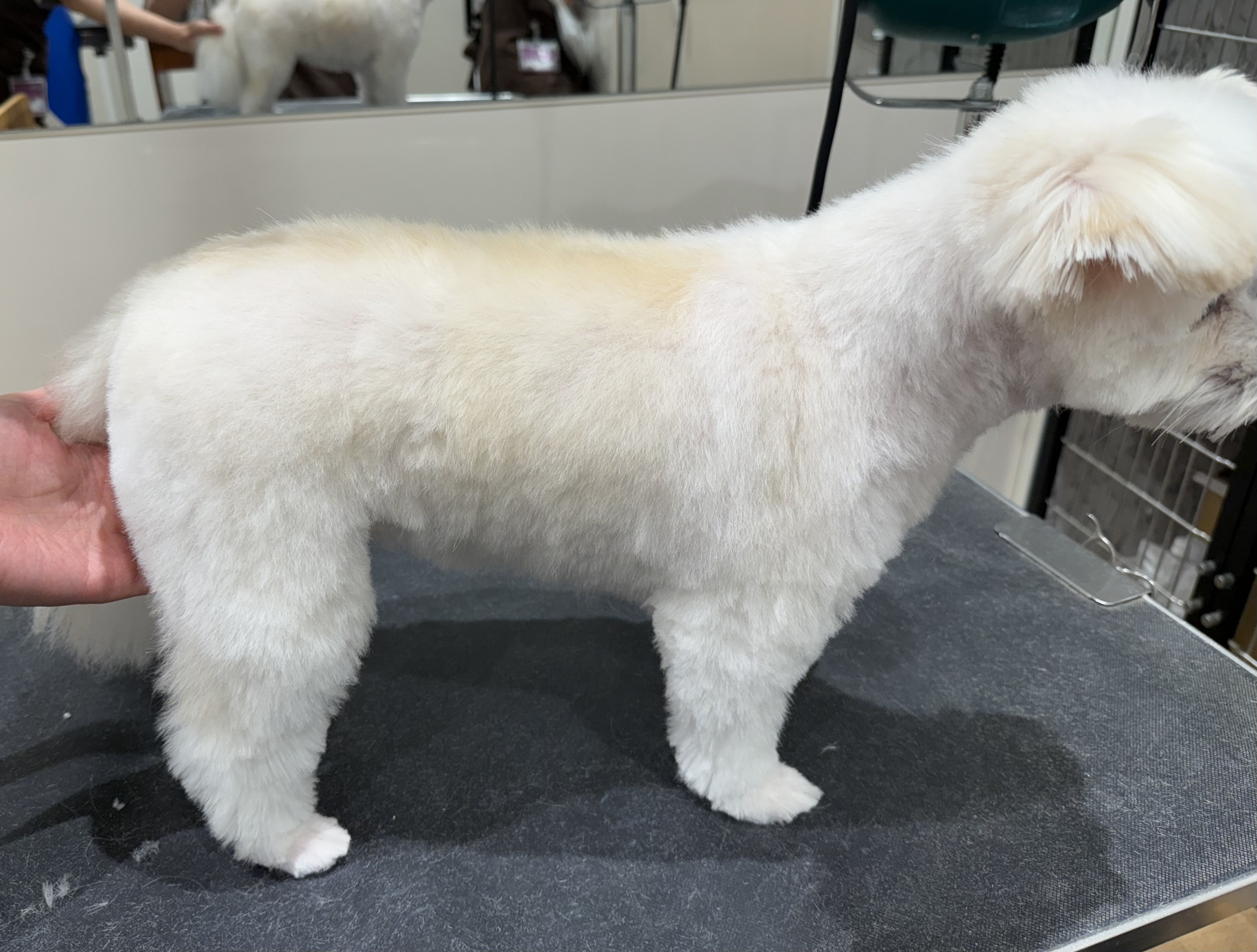 体はアタッチ13mm、足はアタッチ16mmで足先は飼い主様の足先がすぐ汚れるというお悩みがあったので足先は2mmですっきりさせました!お顔は丸く目元はスッキリさせました!
