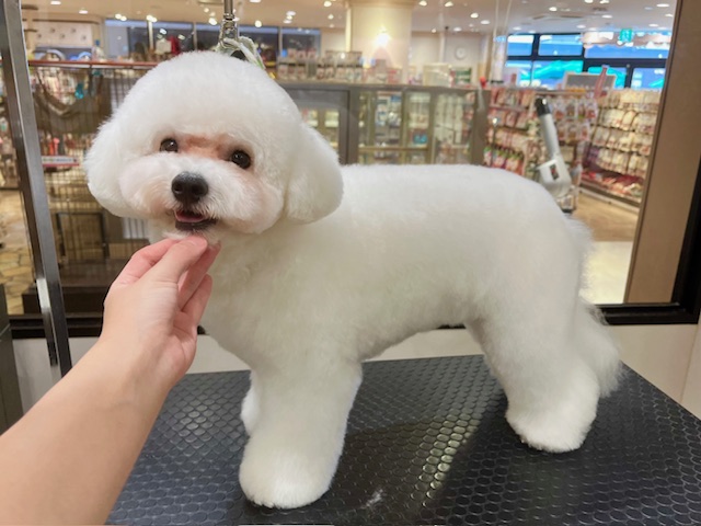ビションフリーゼの全身ハサミ仕上げで、ふんわりになるようにしました!お腹やお尻まわりはすっきり、お顔は頭とお耳を上のラインでつなげるような大きめのぬいぐるみちゃん風にしました♪