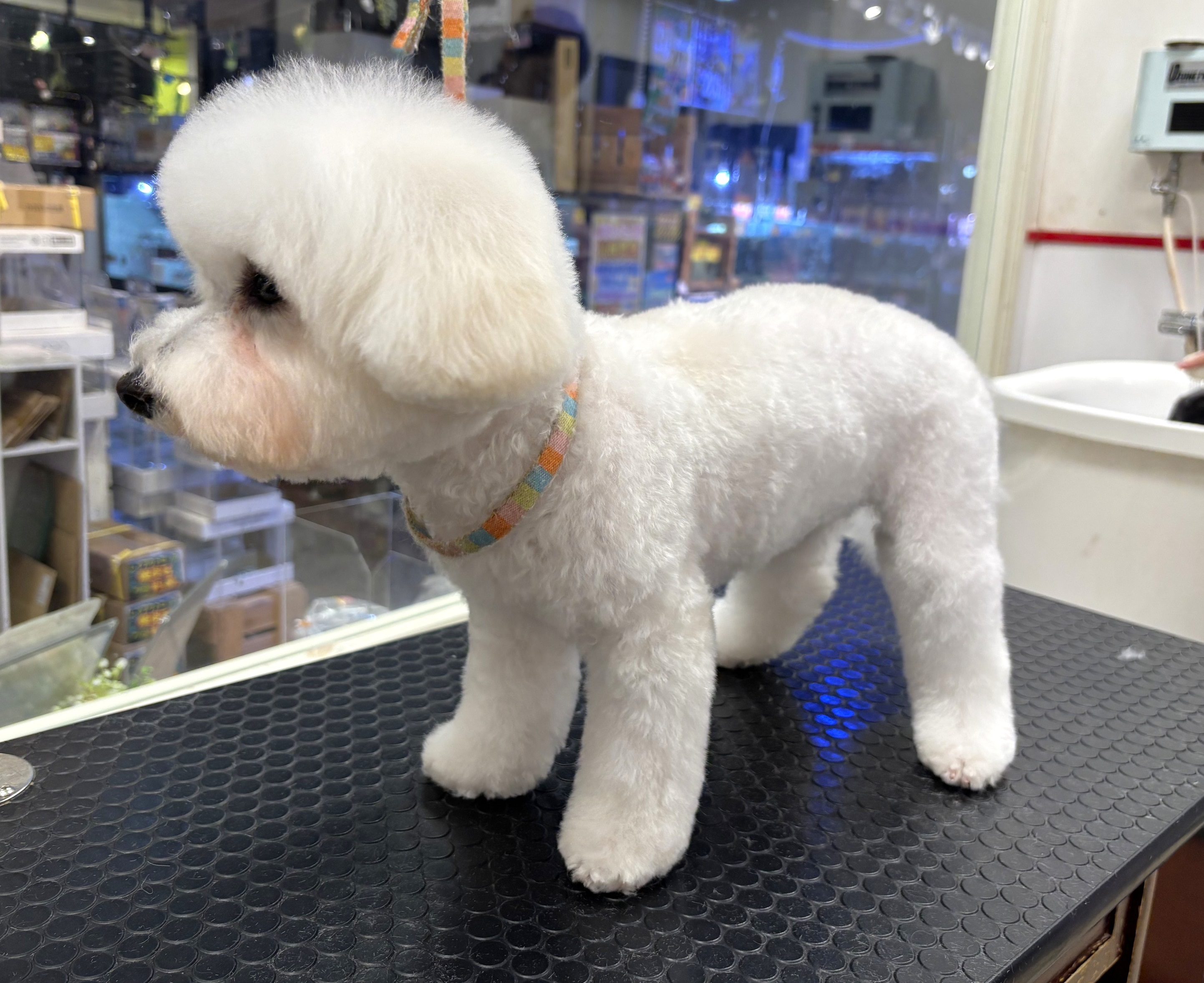 ビションといえばの王道カット!お手入れは大変なので体はさっぱり短くしてます!お顔はまんまるで可愛らしくついつい撫でたくなっちゃいます!
