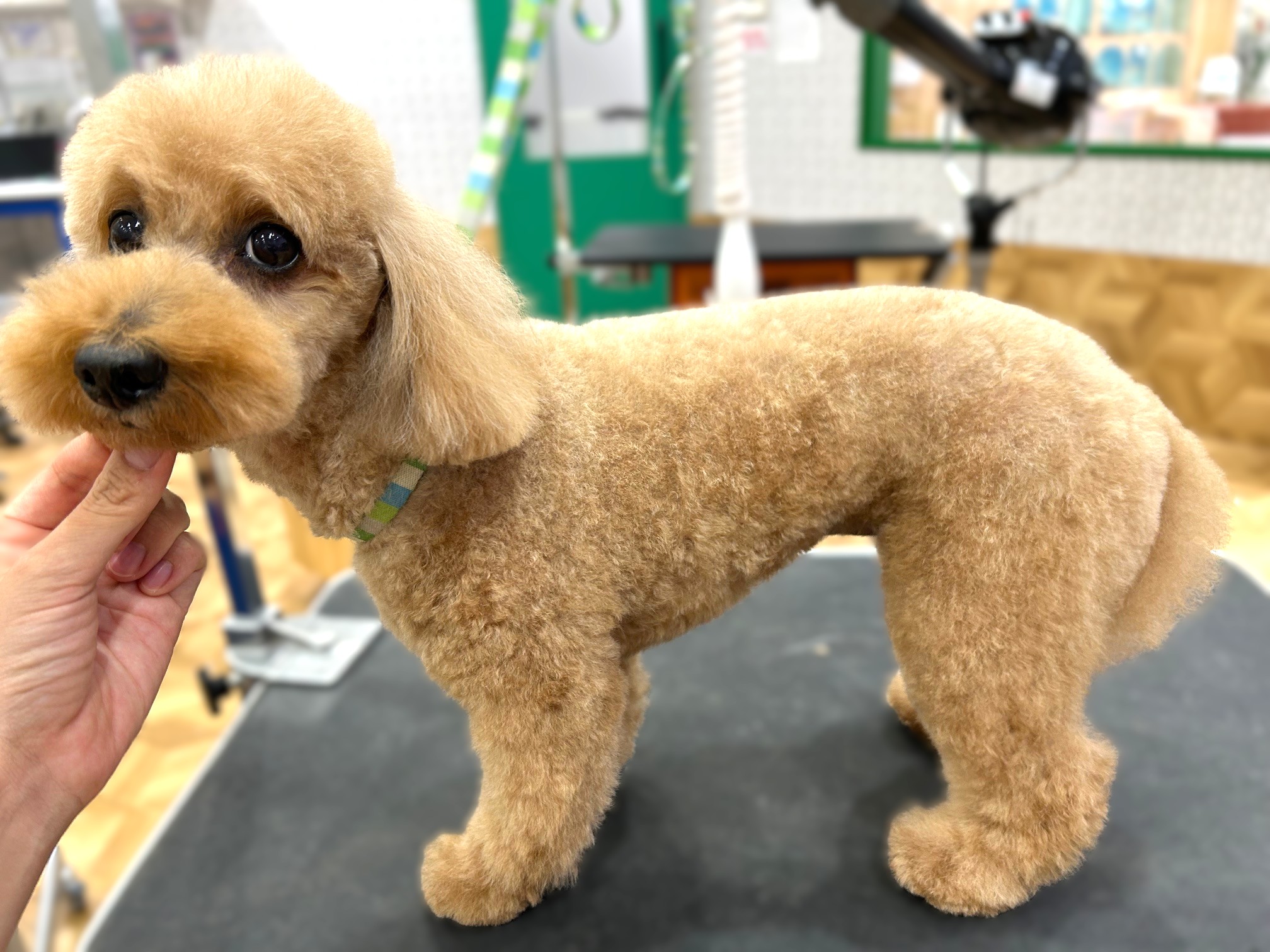体は6ミリのバリカンで刈り、 足は10ミリのバリカンで刈り少しふんわりめに♪ お顔は口周りを丸くして、目の下を スッキリしピーナッツカットにしました!