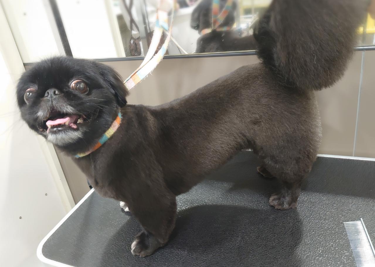 ボディは6mmのバリカンをかけてスッキリと、お尻はハサミで丸みを残しつつスッキリめにカットしました。お顔まわりもスッキリめで丸く仕上げています。