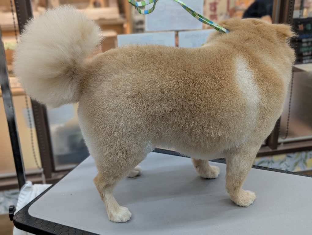 毛先を1センチくらい切って丸くしています。 お尻をすっきりしてポメラニアンらしく丸いフォルムになるように切りました。