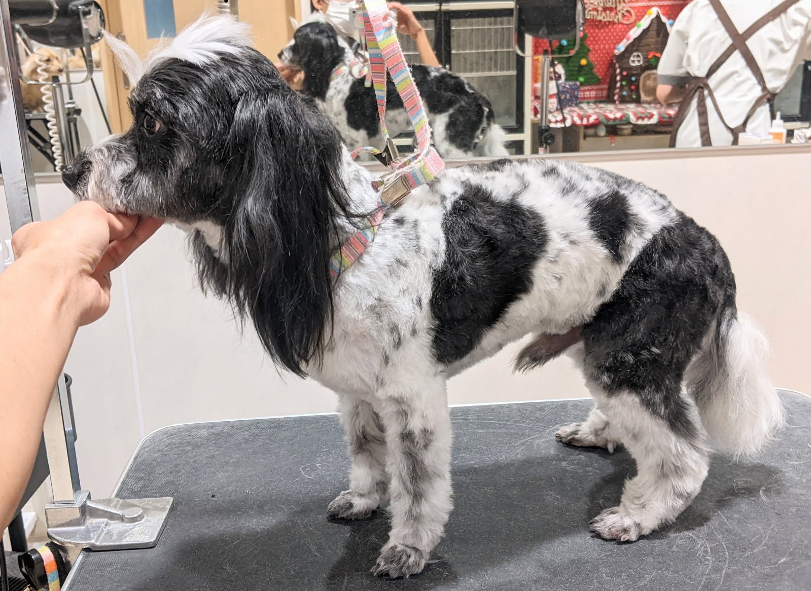 チャームは頭の白いモヒカン☆思い切って両サイドを5ミリで刈って、差をはっきりさせています!カッコイイですね^^しっぽとお耳の長く残している毛がモヒカンと相まって、個性的で似合っていると思います!
