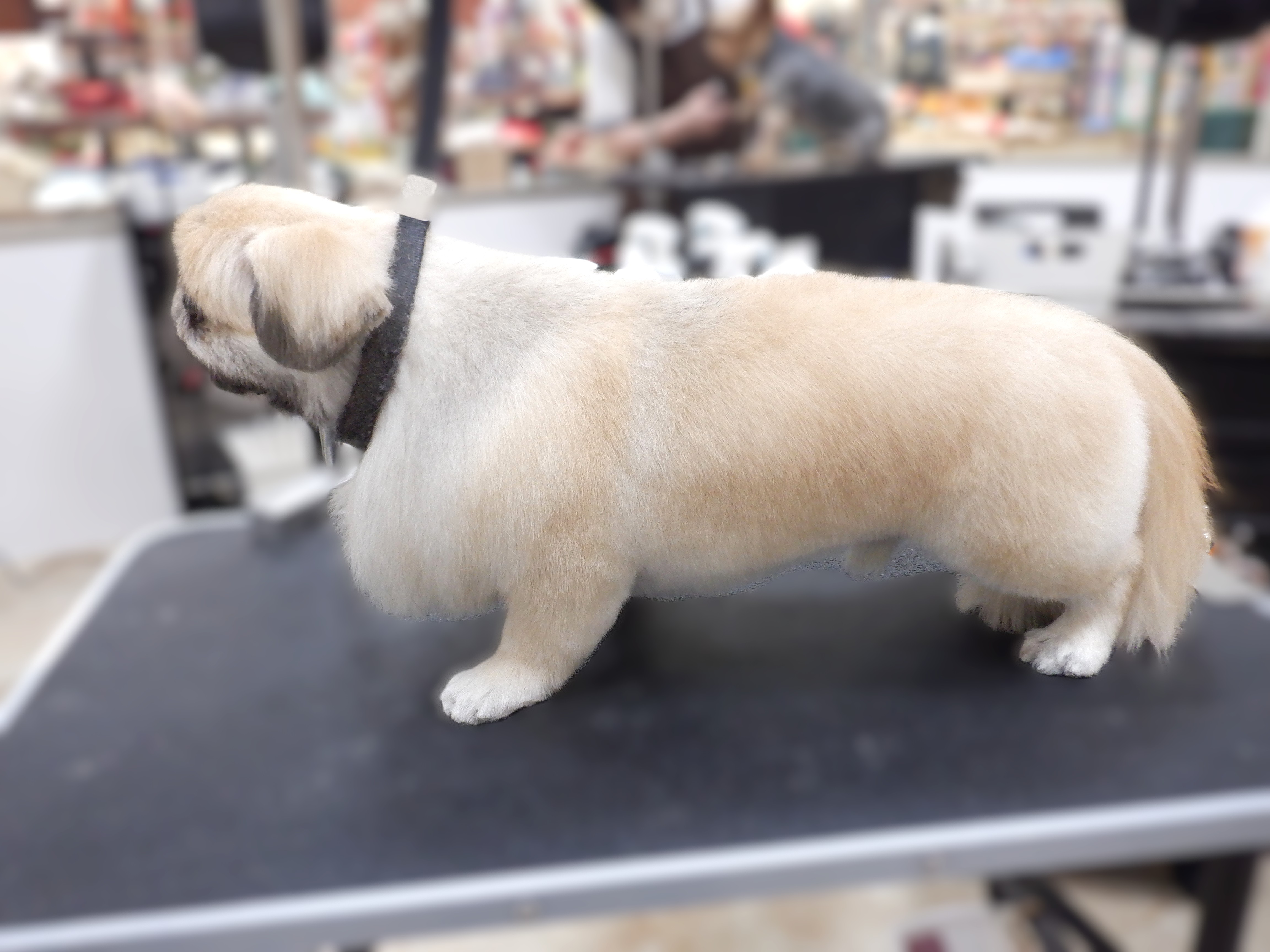 ハサミで全身短めにカット!前胸は残して丸くふんわりさせました!お顔は丸くカットしお耳はスッキリ短くカットしました!