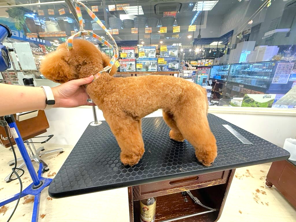 目元はすっきりさせつつ、お顔は全体的に ぬいぐるみのような丸いテディに仕上げました! 体は8mmバリカンで、足は体に合わせてカットしました!