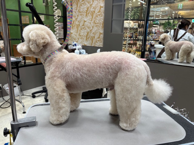 体は5ミリで足は体に合うようにふんわりめにカットしました。顔は汚れやすい口元はすっきりで、頭は丸くカットし、耳は13ミリを当てて耳なりにカットしました。