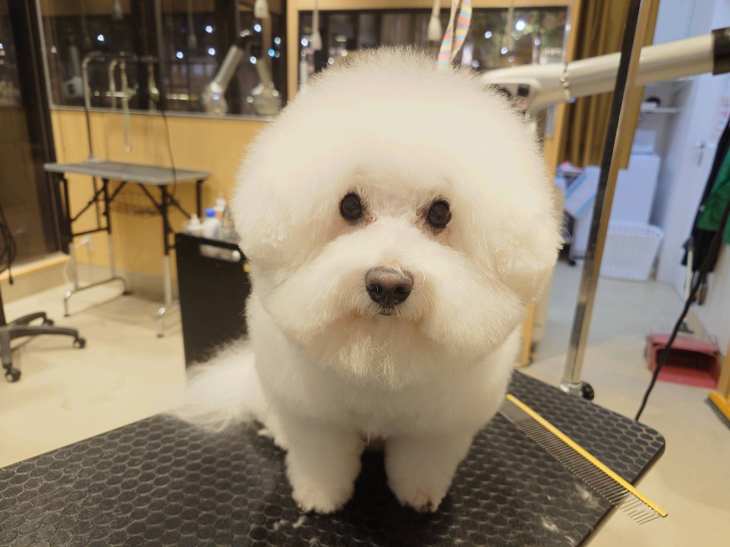 ビションちゃんでふんわりさせたかったので全身はさみで仕上げました。お顔はまん丸ビションにするために輪郭のところを切り上げすぎないように気を付けました。チッピングで全身かわいく綺麗に仕上げれました!