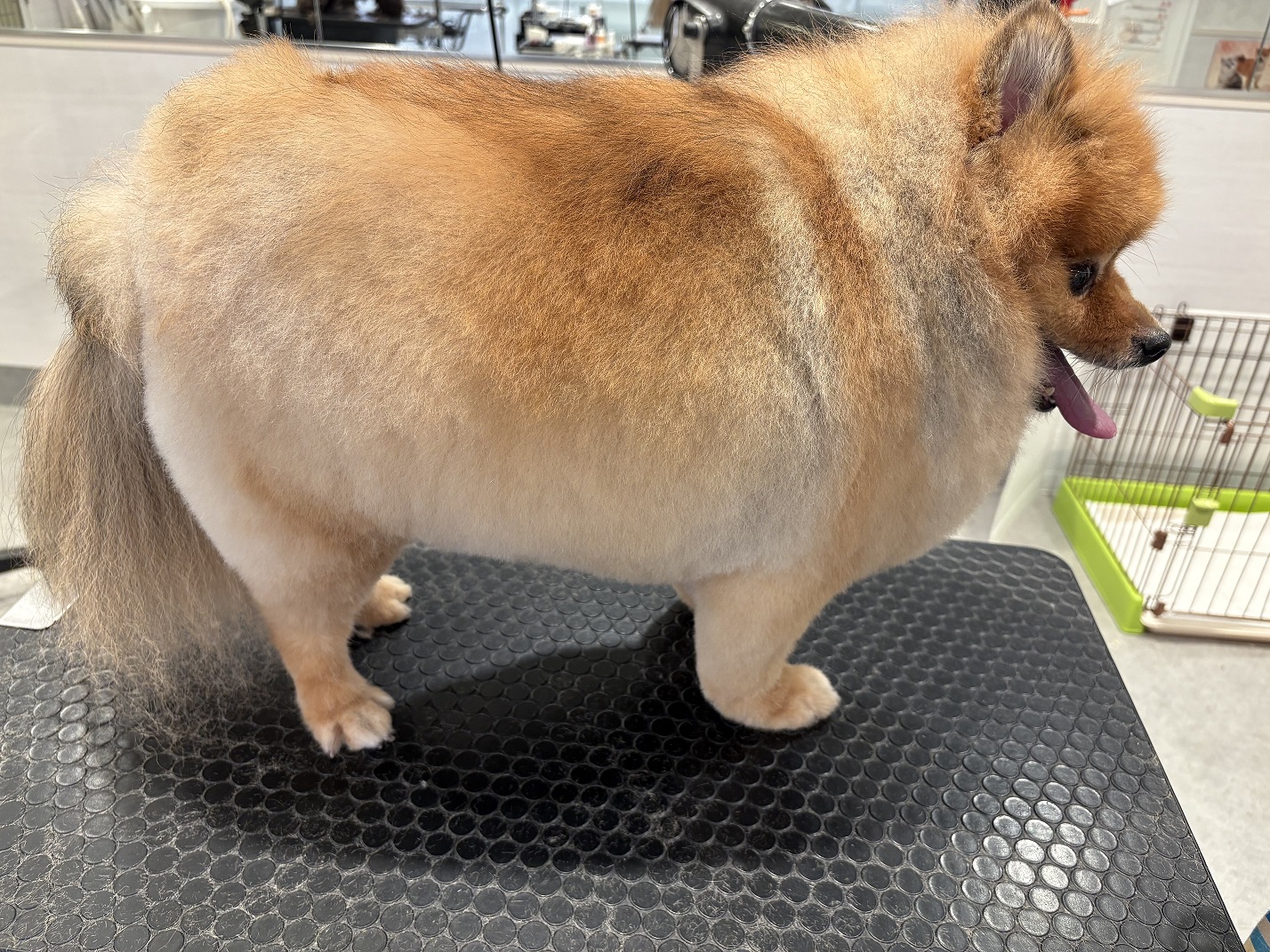 全体的に背中以外の毛を短めにハサミで丸くカットしました。