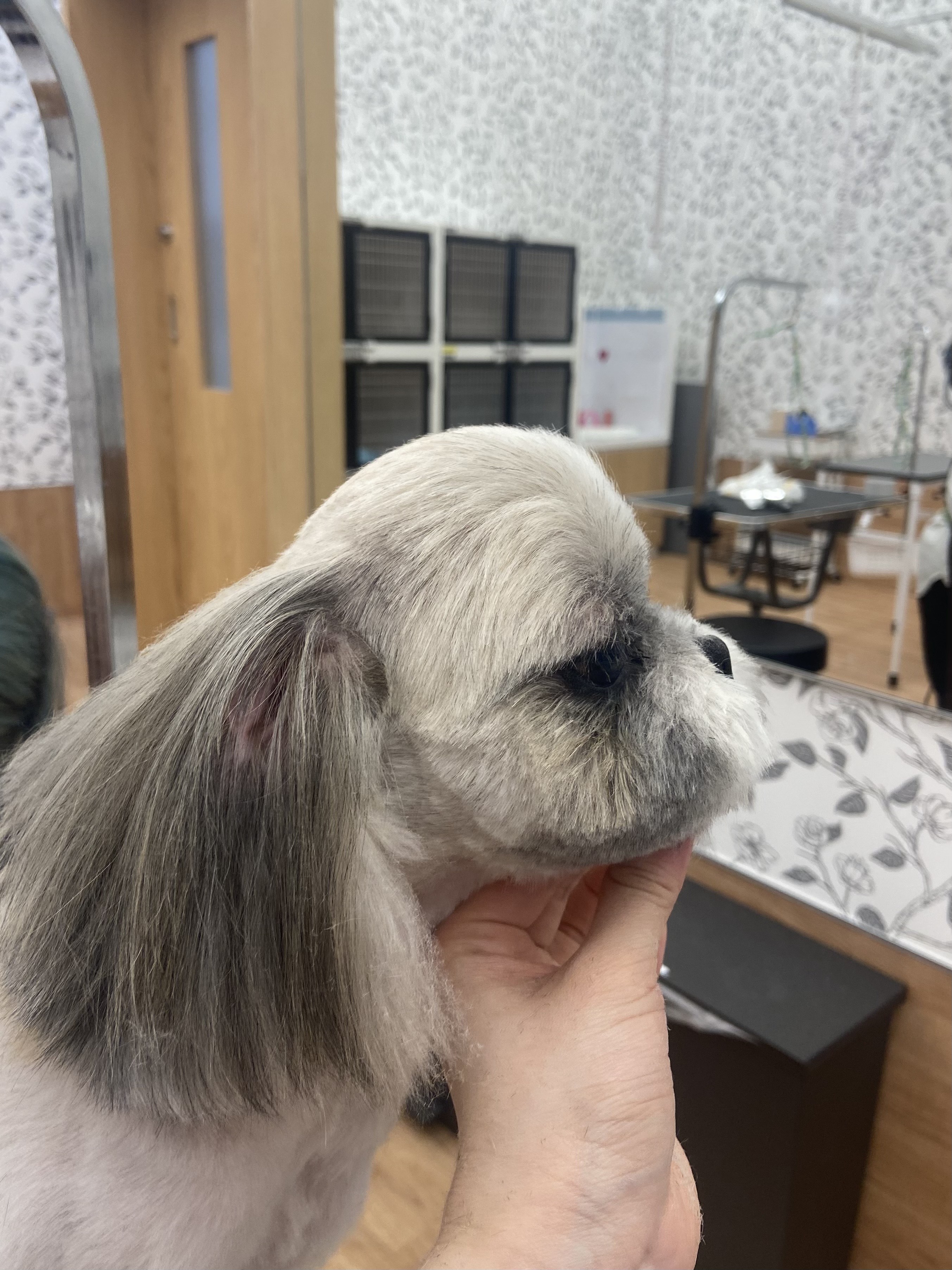 シーズーはお耳が立つと角が出てきてしまうので お耳が立っても丸さを維持できるように意識してカットしました。 横から見ても角が出ないようにカットしました。