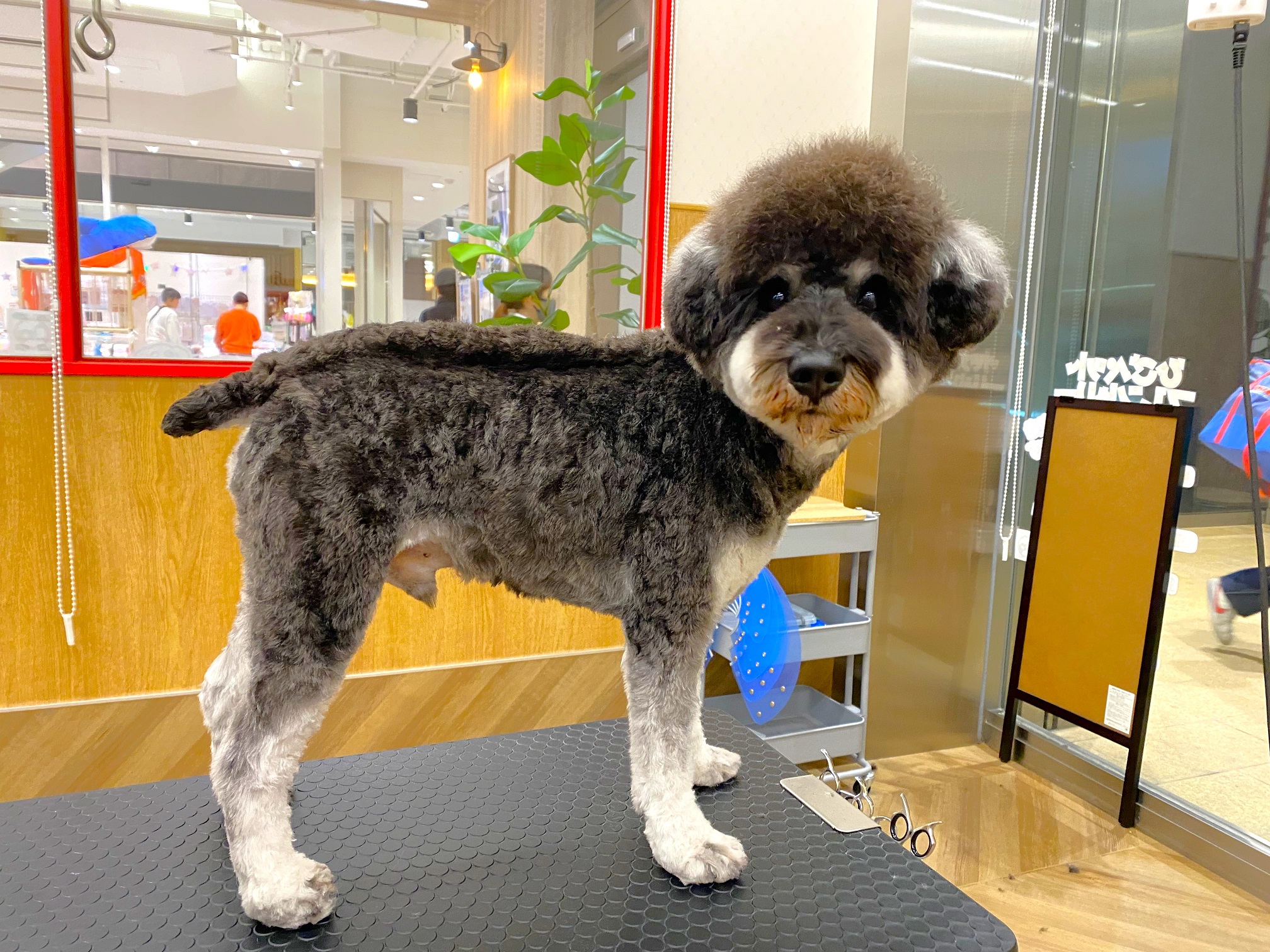 体は5ミリのバリカンで 背中はモヒカンスタイルに お顔はふんわりアフロヘアで マズルはスッキリめにしました。