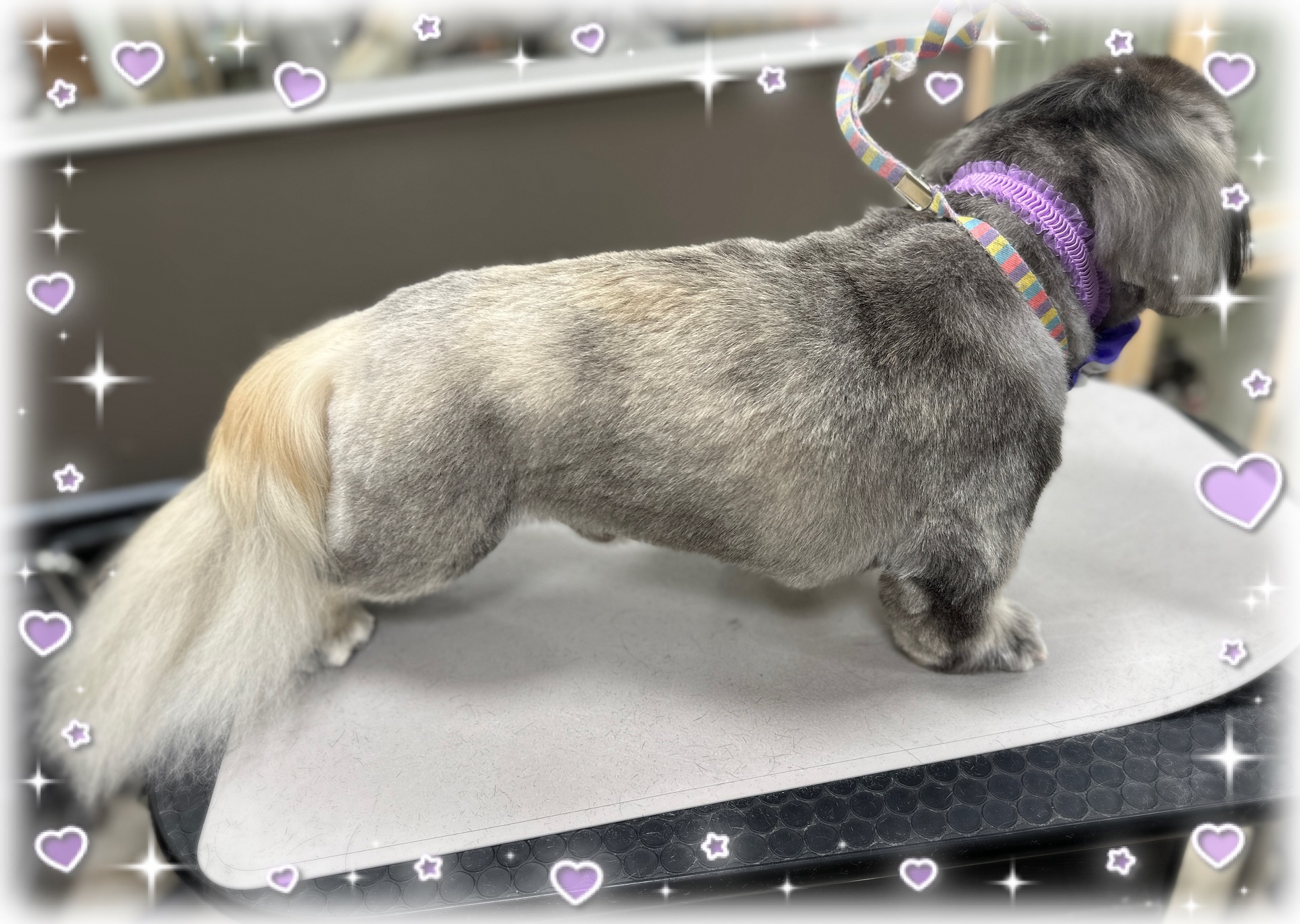 体は10ミリで短くカットし、しっぽはふんわり長めに、耳はハサミで短く、お顔は丸く可愛らしく仕上げました!