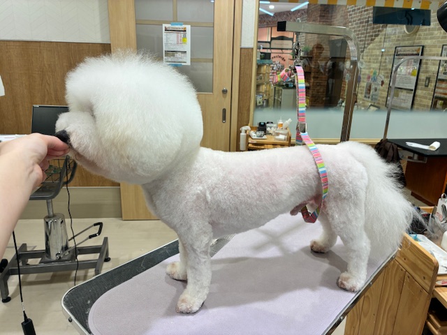ビションカットですが大福のように大きくまんまるお顔です。全身は、7ミリでスッキリ!お顔が目立って可愛いカットスタイルです。