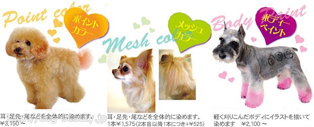 2010年よりカラーリングも始めました。6種のハーブを使用したワンちゃんの被毛、皮膚にも優しいカラー剤です。完全ご予約制となります。ご予約時に「カラーリング希望」とお伝えください。 ※カラーリングのご注意 ・傷、皮膚病などがあるワンちゃんはカラーリングできません。 ・産後、病中病後のワンちゃんはご遠慮ください。 ・毛色、毛質によって色の仕上がりが多少異なります。